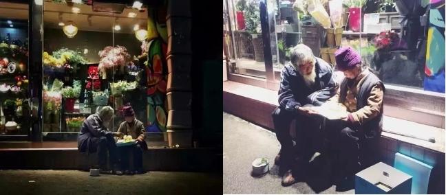 就像長沙街頭,一位長期在街上乞討的老爺爺正在給老伴兒過生日。
